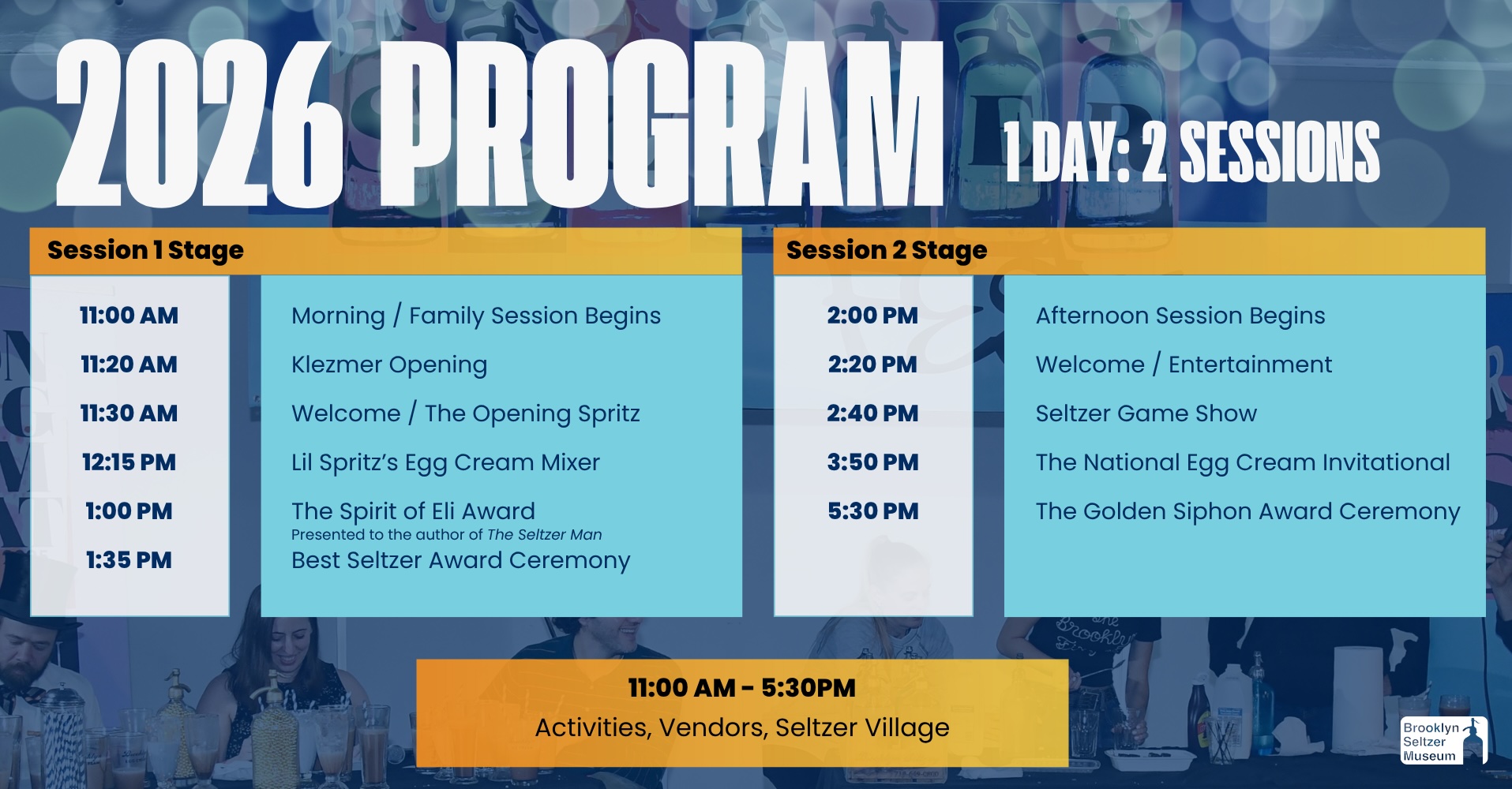 - Session 2: 2:00pm-6:00pm. Seltzer sampling, booth and floor activities + festival programming, including the 3rd National Egg Cream Invitational.
